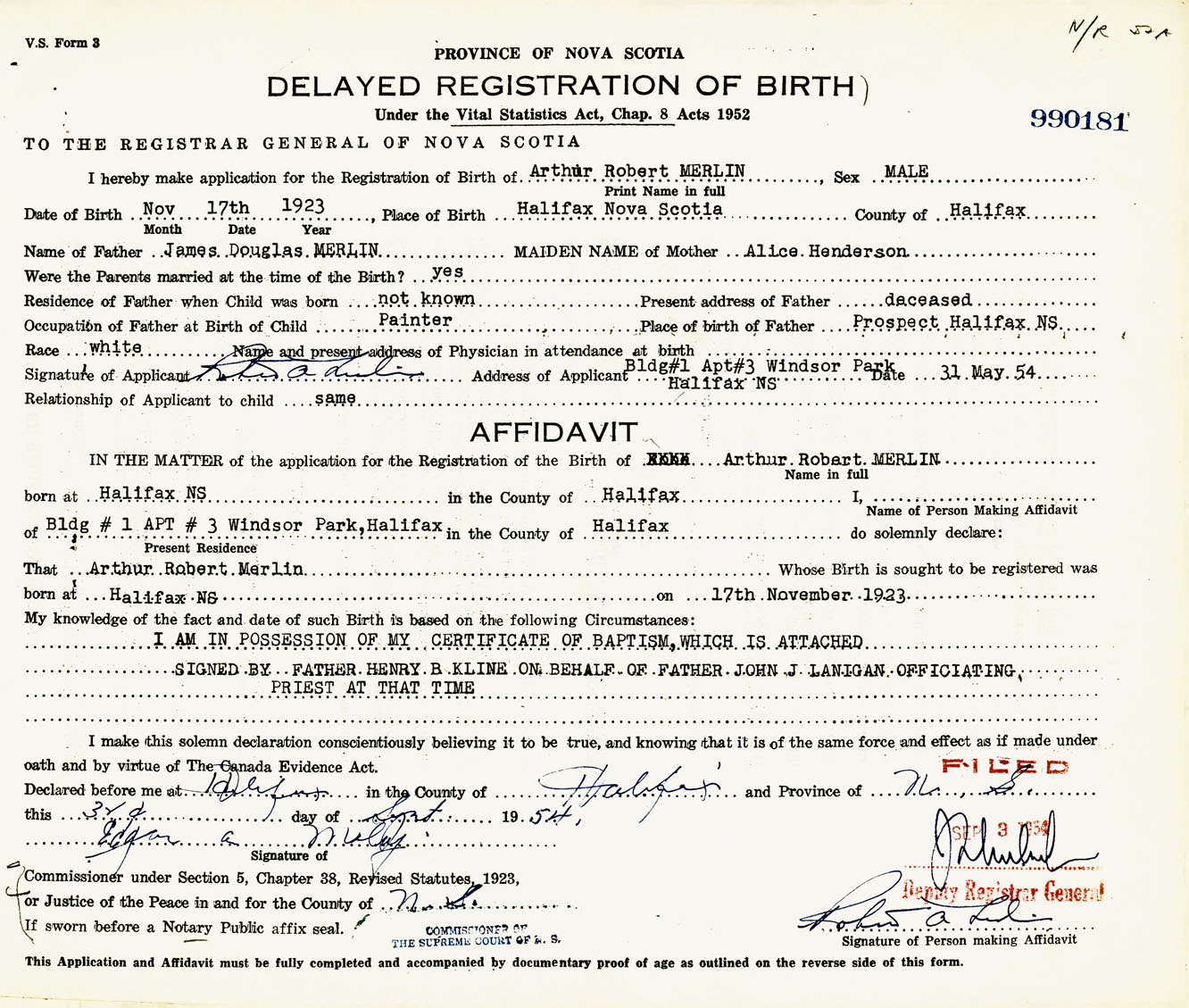 Signature of Applicant Robert A. Merlin Address of Applicant Building #1, Apartment #3, Windsor Park, Halifax, NS Date 31 May 1954