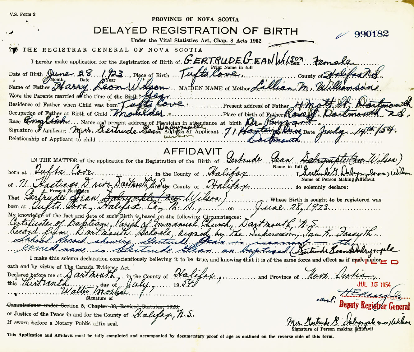 Signature of Applicant Mrs. Gertrude Gean Dalrymple Wilson Address of Applicant 71 Hastings Drive, Dartmouth, NS Date 14 July 1954