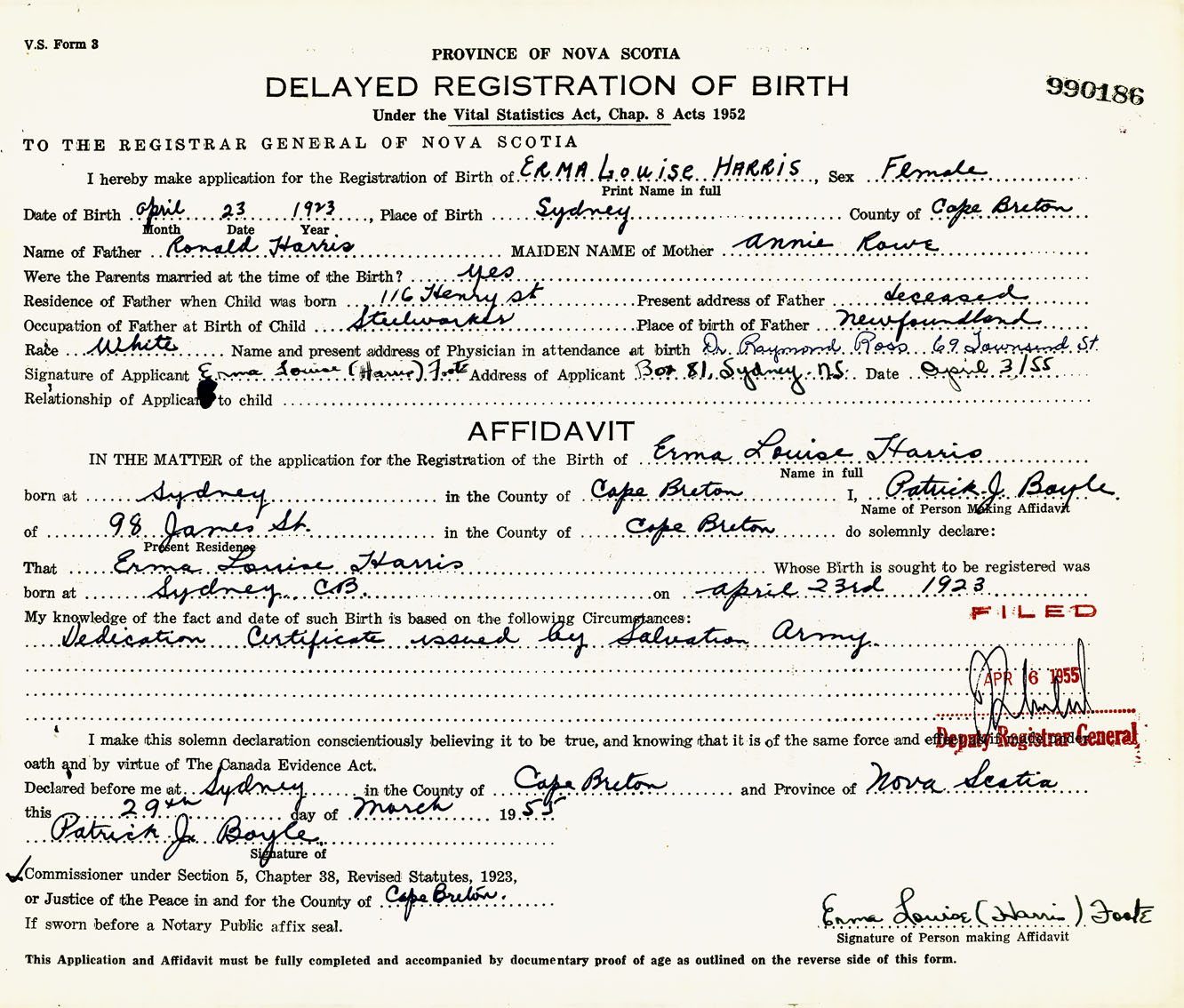 Signature of Applicant Erma Louise Harris Foote Address of Applicant Box 81, Sydney, Cape Breton Co., NS Date 3 April 1955