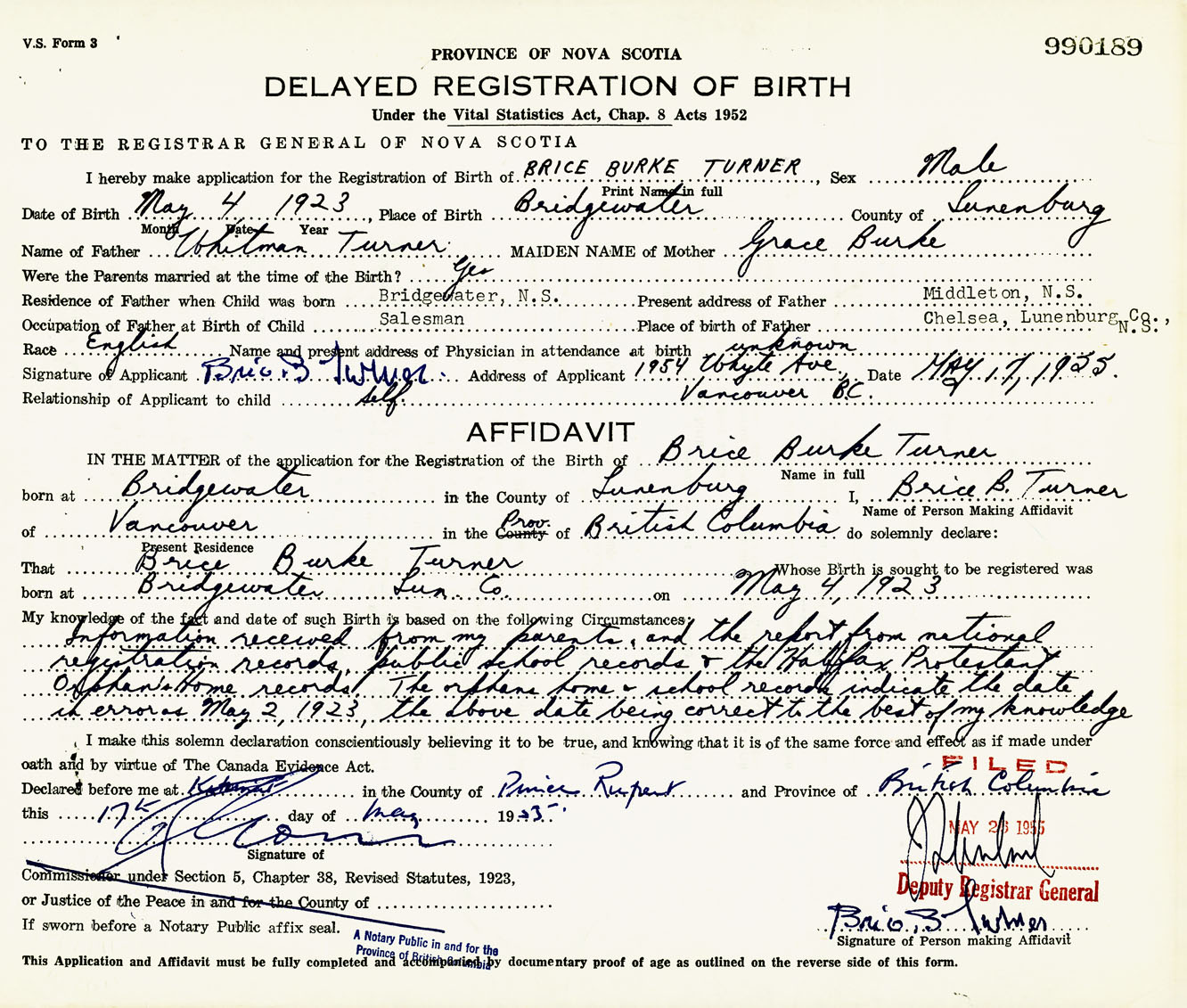 Signature of Applicant Brice B. Turner Address of Applicant 1954 Whyte Avenue, Vancouver, British Columbia Date 17 May 1955
