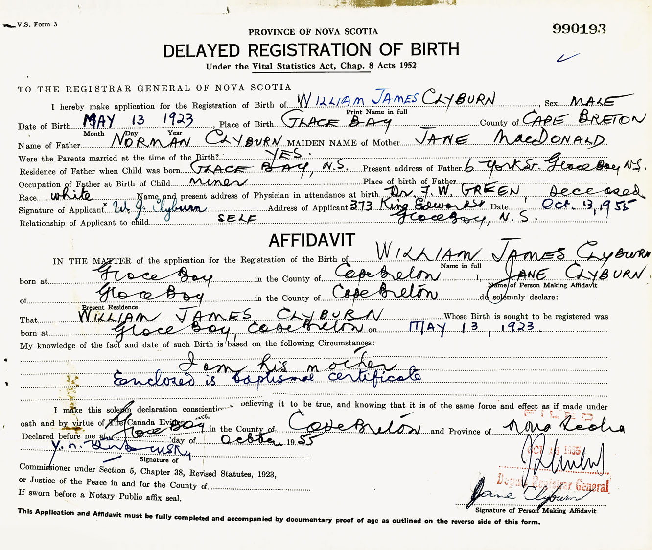 Signature of Applicant W. J. Clyburn Address of Applicant 373 King Edward Street, Glace Bay, Cape Breton Co., NS Date 13 October 1955
