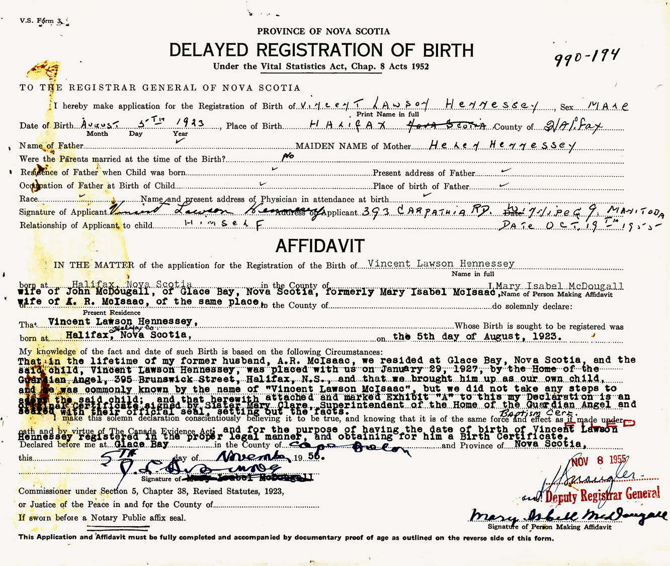 That in the lifetime of my former husband, A. R. McIsaac, we resided at Glace Bay, Nova Scotia and the said child, vincent Lawson Hennessey, was placed with us on January 29, 1927 by the Home of the Guardian Angel, 395 Brunswick Street, Halifax, NS and that we brought him up as our own child and he was commonly known by the name of "Vincent Lawson McIsaac", but we did not take any steps to adopt the said child; and that herewith attached and marked Exhibit "A" to this my declaration is an original certificate signed by Sister Mary Clare, Superintendent of the Home of the Guardian Angel and sealed with their official seal, setting out the facts.