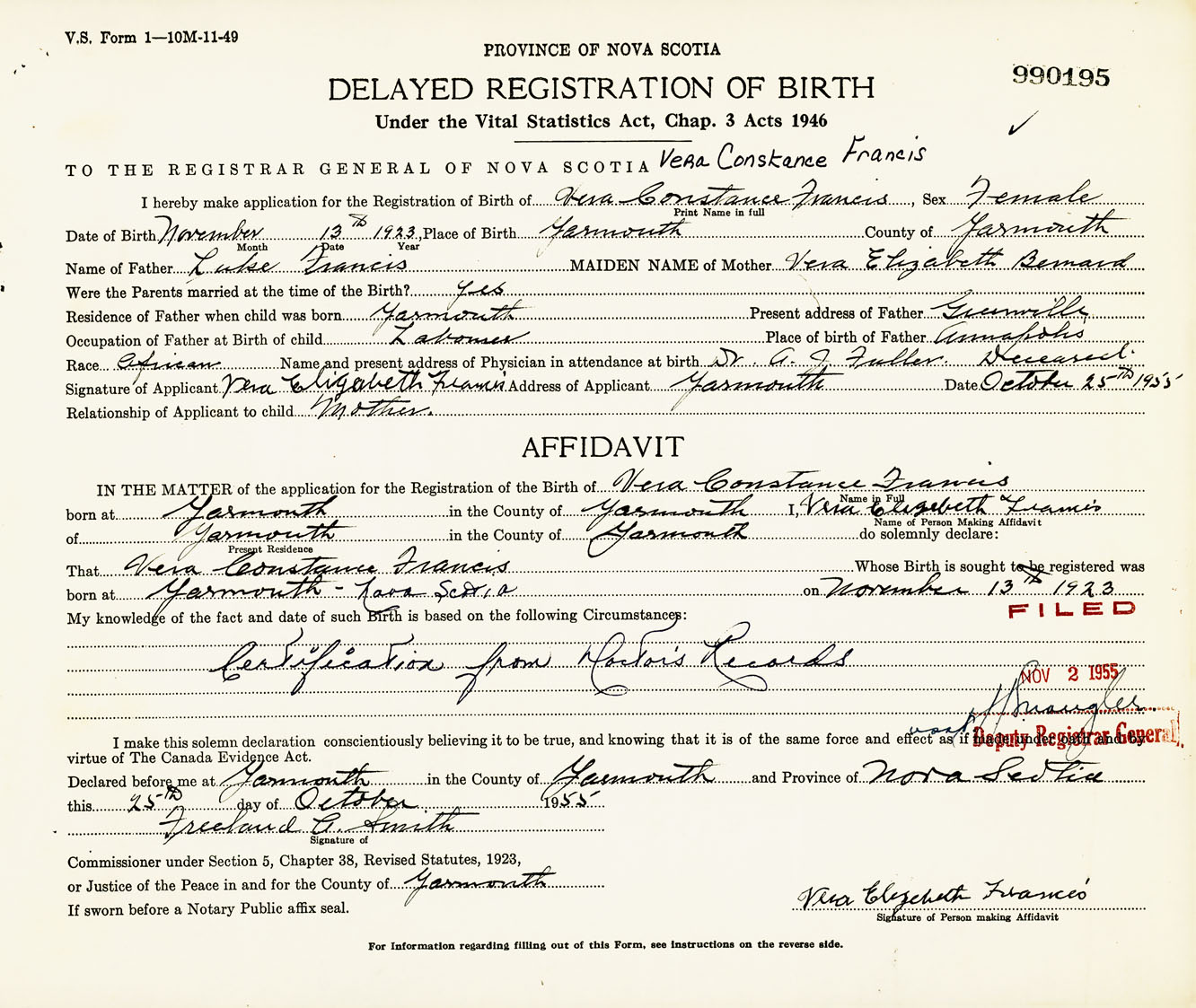Signature of Applicant Vera Elizabeth Francis Address of Applicant Yarmouth, NS Date 25 October 1955