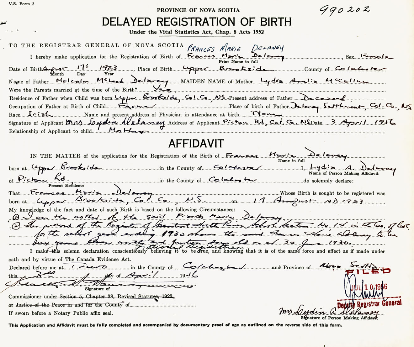 1. I am the mother of the said Frances Marie Delaney. 2. The record of the register of Central North River School Section no. 14 in the County of Colchester six years eleven months and fourteen days old as of 30 June 1930. (National Registration)