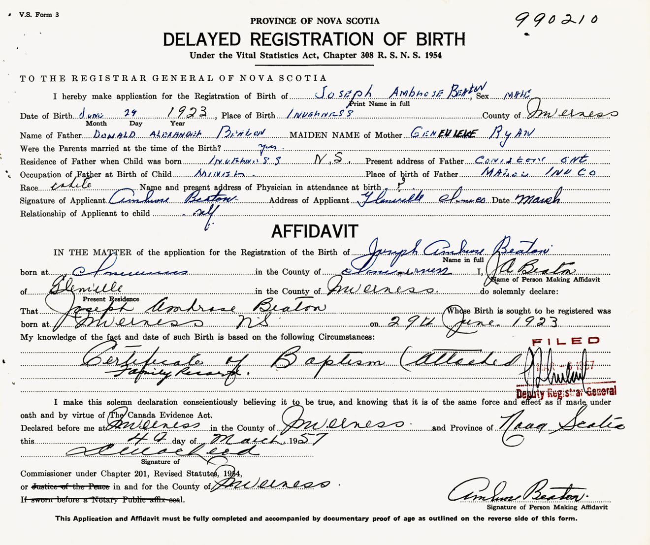 Signature of Applicant Ambrose Beaton Address of Applicant Glenville, Inverness Co., NS Date March 1957