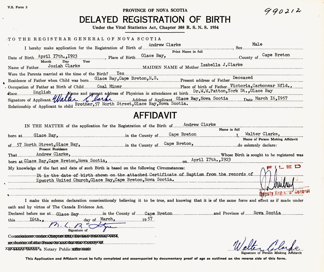 Signature of Applicant Walter Clark Address of Applicant Glace Bay, Cape Breton Co., NS Date 16 March 1957