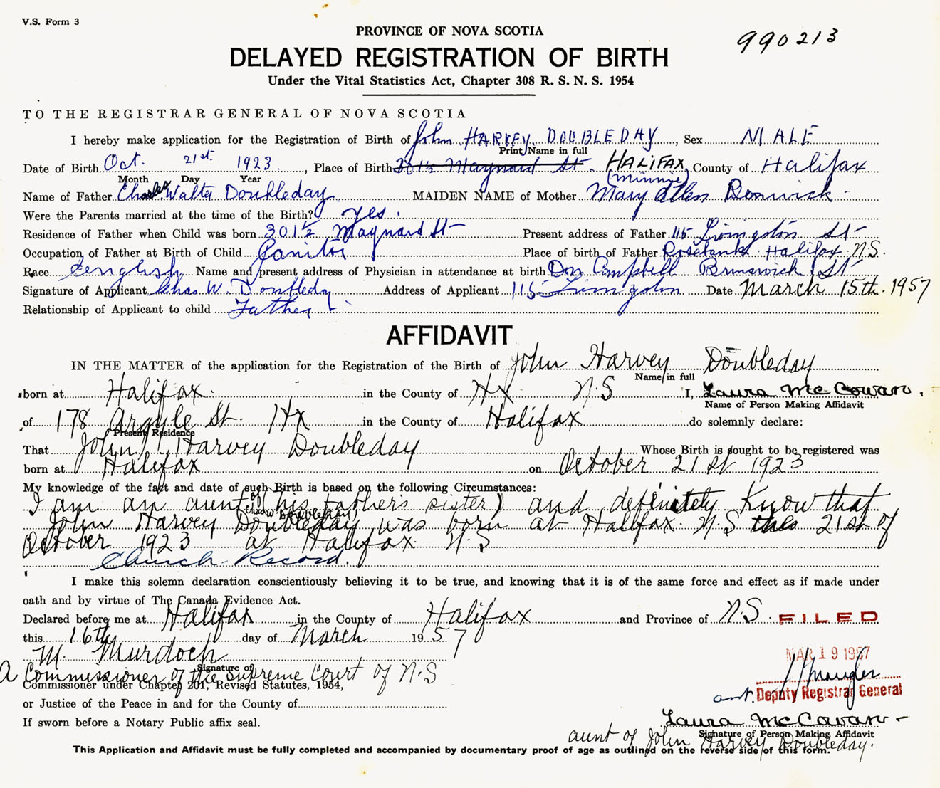 I am an Aunt (his father's sister) and definitely know that John Harvey Doubleday was born at Halifax, NS the 21st of October 1923 at Halifax, NS. Church record.