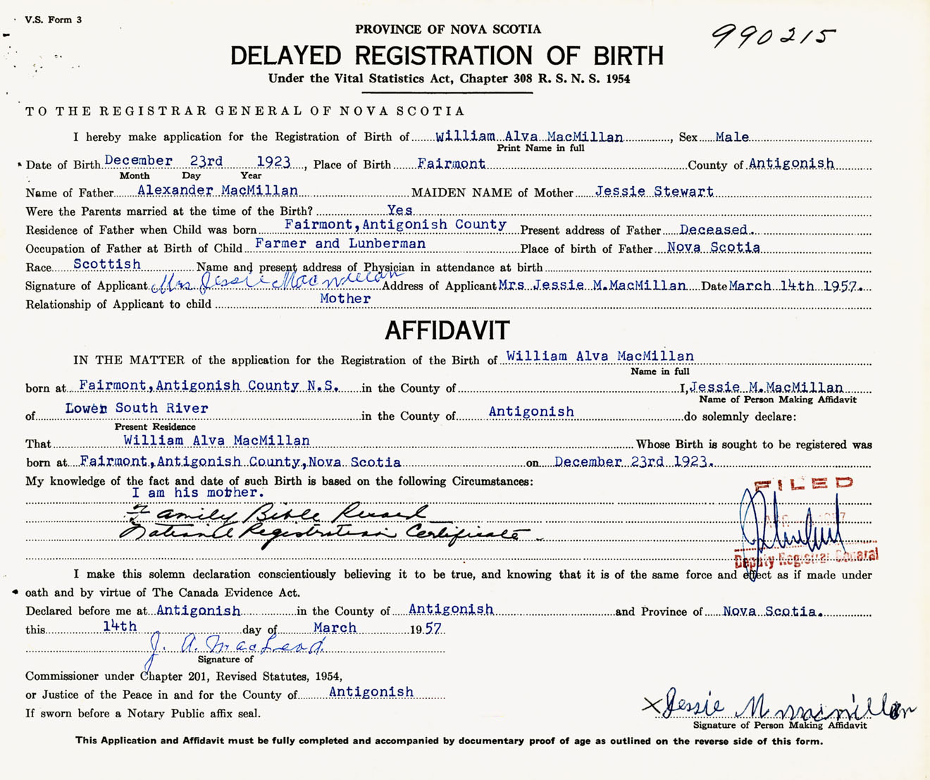 IN THE MATTER of the application for the Registration of the Birth of william AlvaMacMillan
