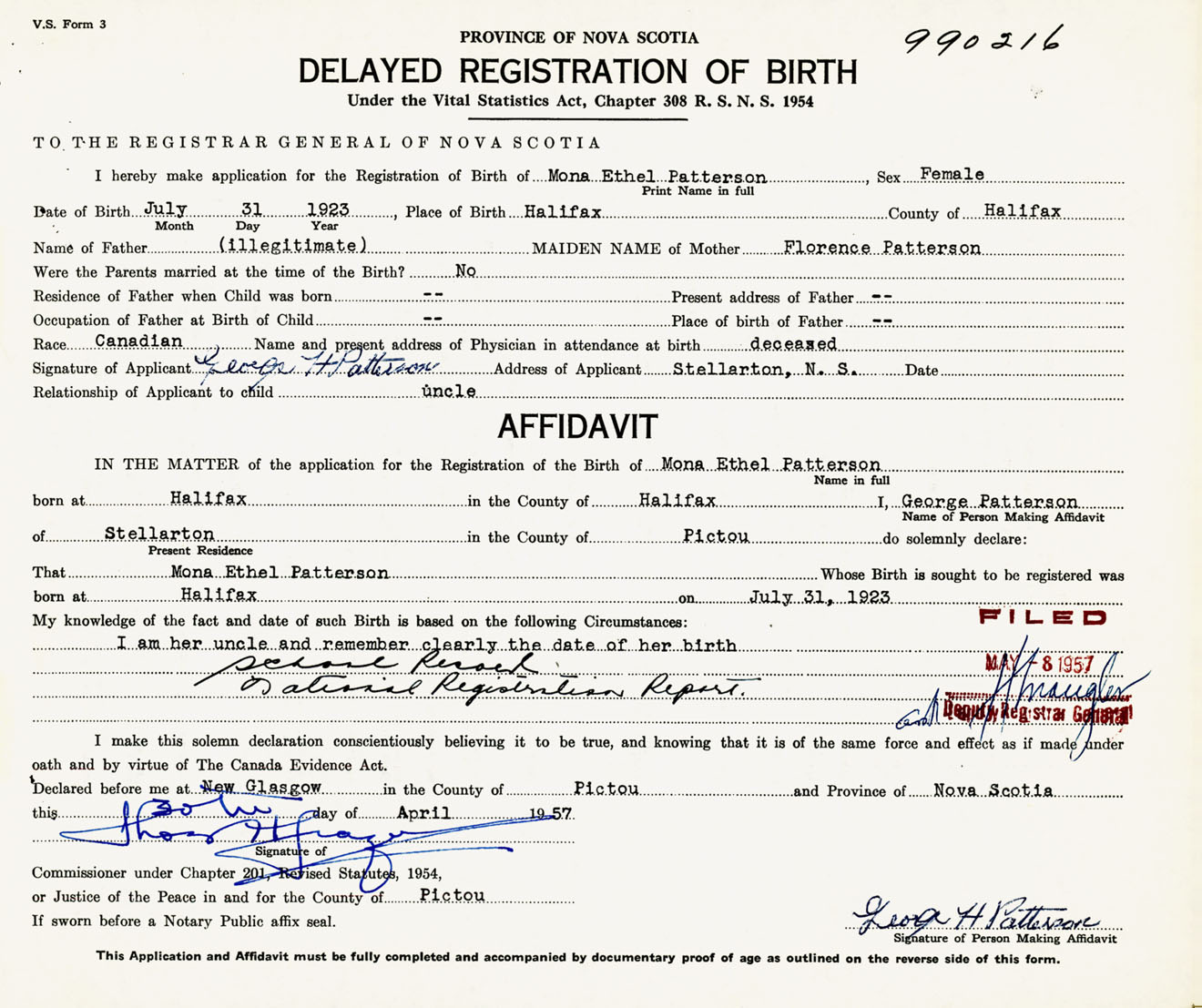 I hereby make application for the Registration of Birth of Mona EthelPatterson Sex Female