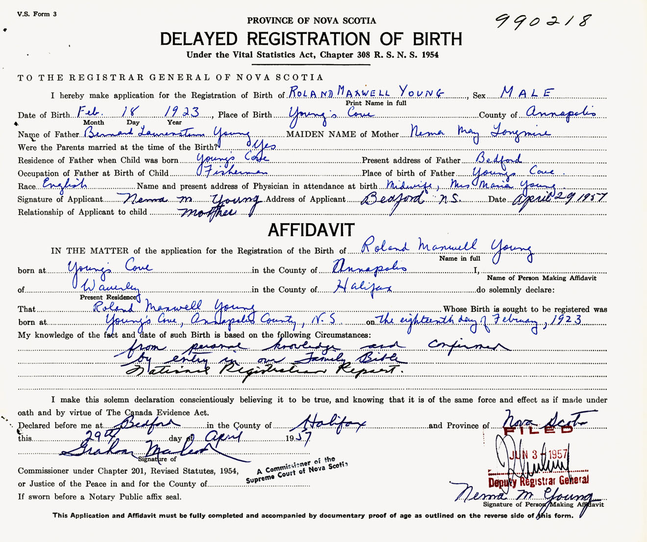 I hereby make application for the Registration of Birth of Roland MaxwellYoung Sex Male