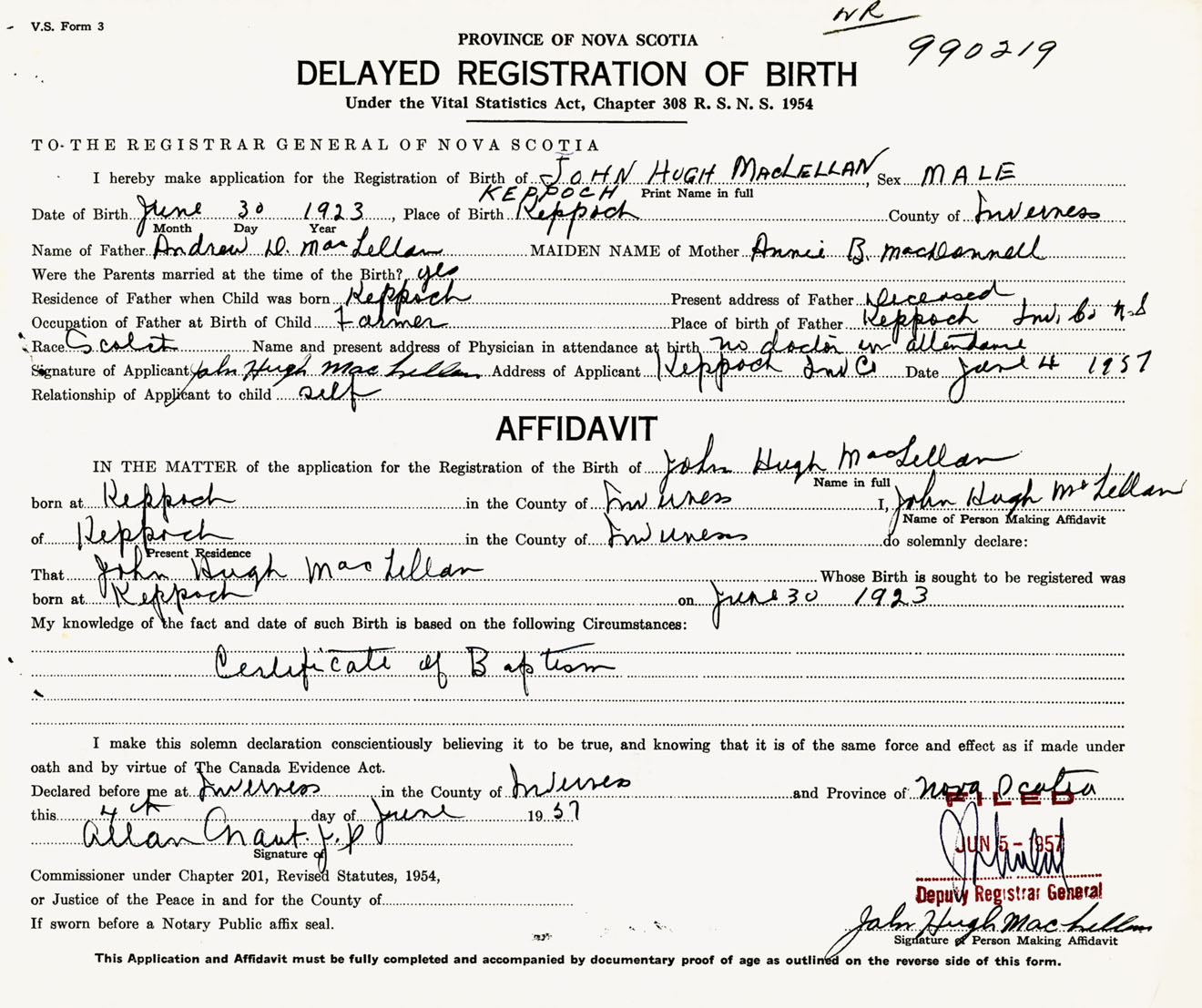 Signature of Applicant John Hugh MacLellan Address of Applicant Keppoch, Inverness Co., NS Date 4 June 1957