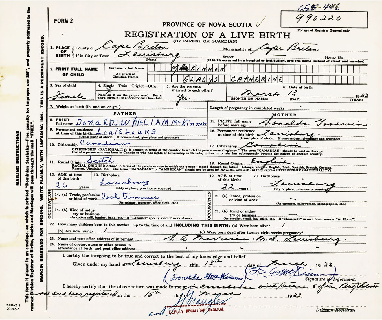 Date of Birth March 13, 1923 Place of Birth LouisbourgCounty of Cape Breton
