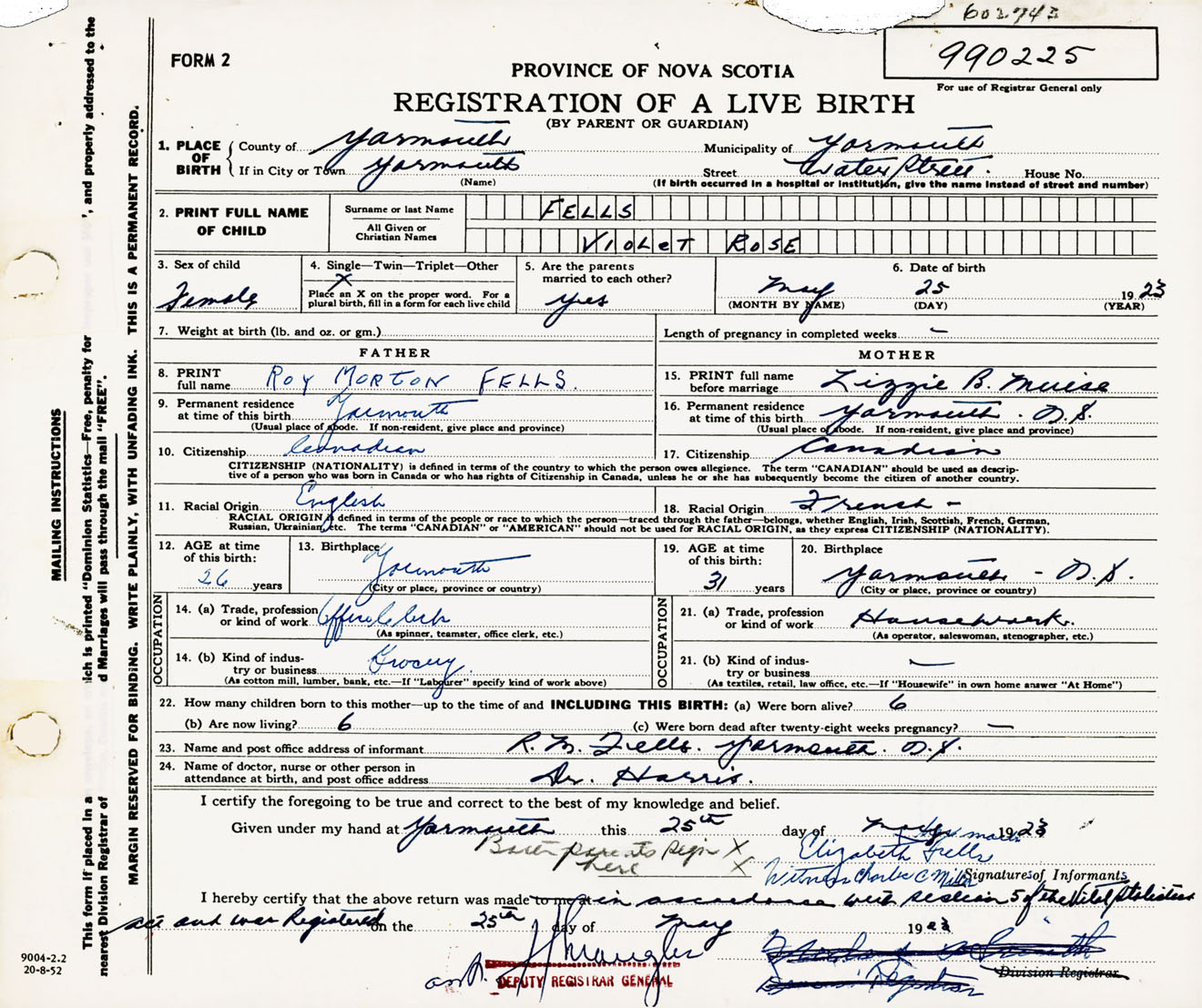 Date of Birth May 25, 1923 Place of Birth YarmouthCounty of Yarmouth