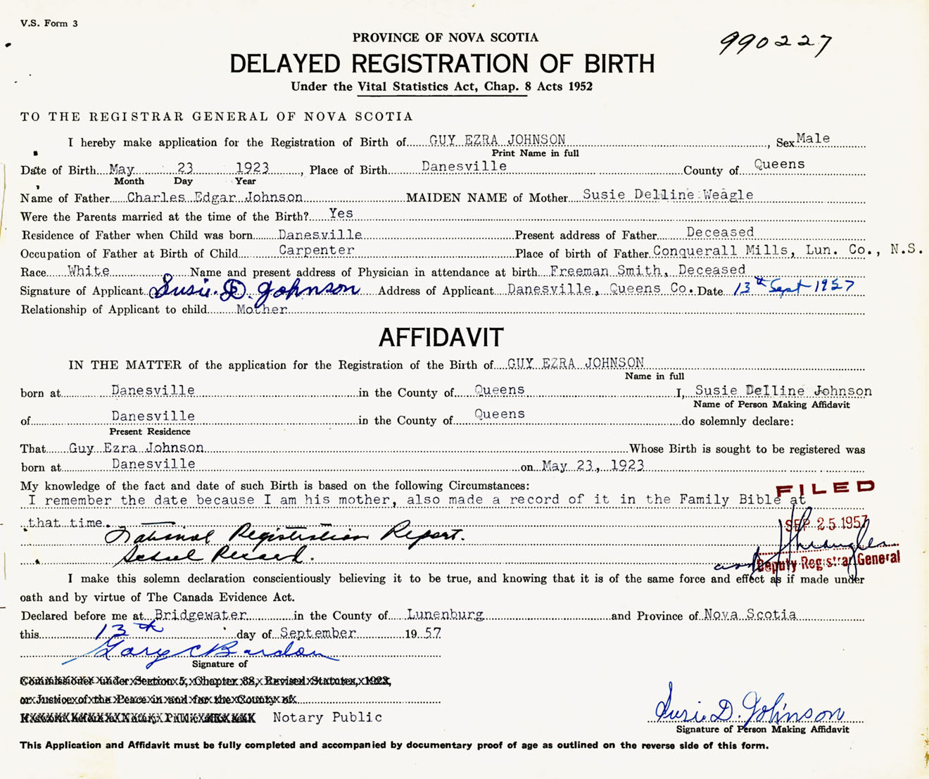 Signature of Applicant Susie D. Johnson Address of Applicant Danesville, Queens Co., NS Date 13 September 1957