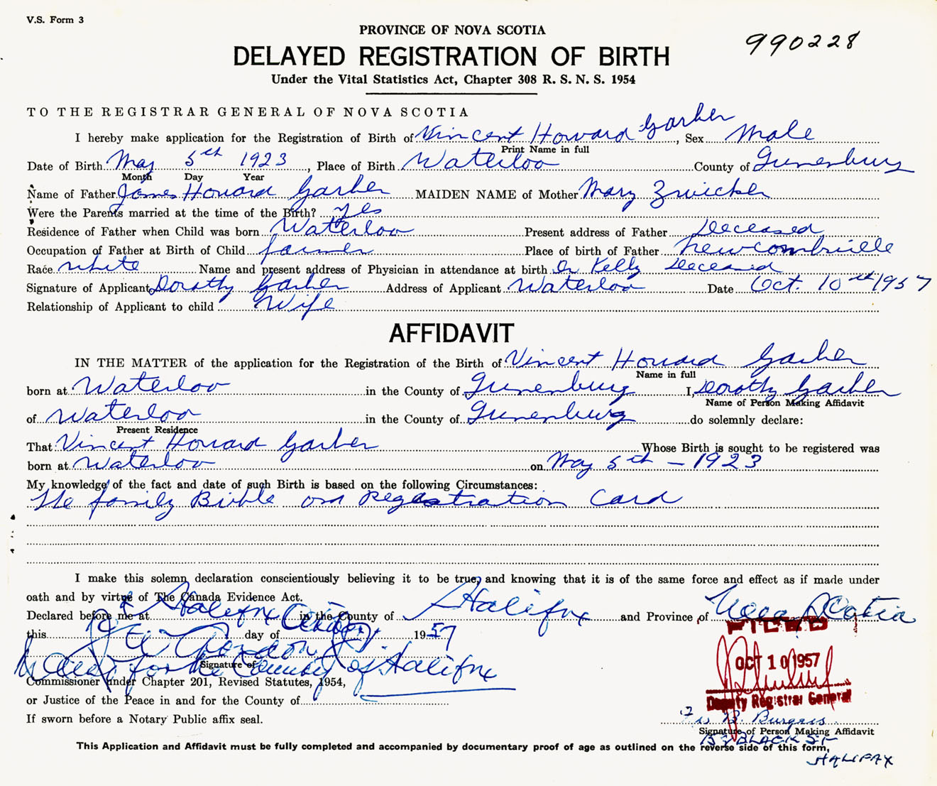 Signature of Applicant Dorothy Garber Address of Applicant Waterloo, Lunenburg Co., NS Date 10 October 1957