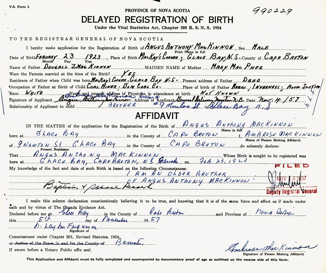 Signature of Applicant Angus Anthony MacKinnon Address of Applicant General Delivery, Moncton, New Brunswick Date 4 November 1957
