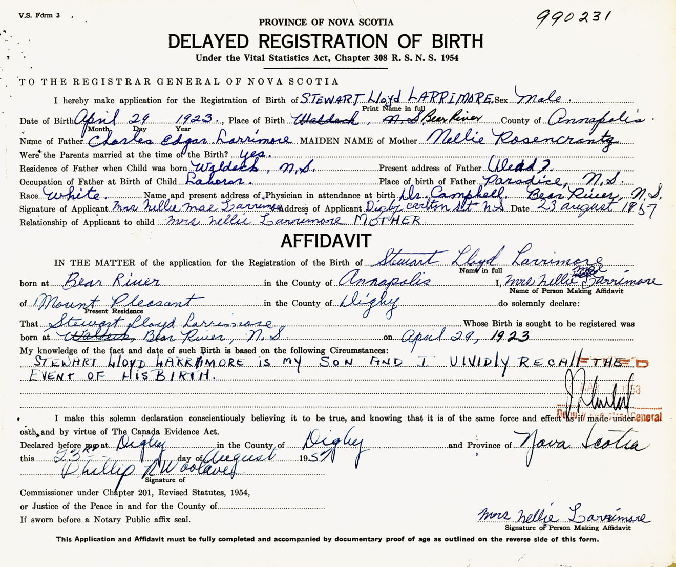 Date of Birth April 29, 1923 Place of Birth Bear RiverCounty of Annapolis