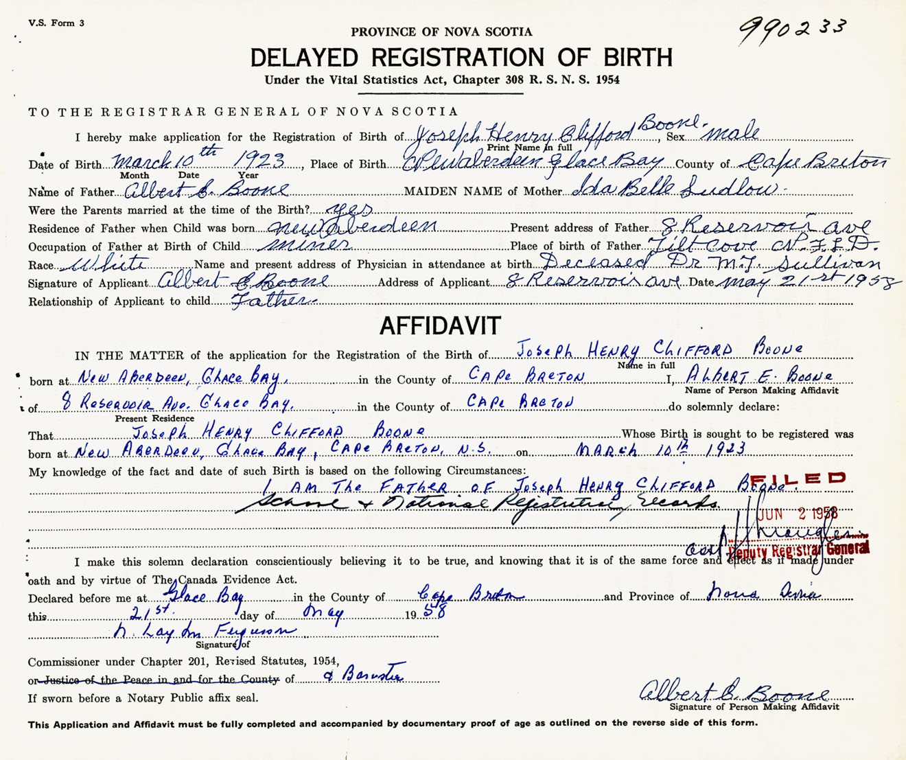 Signature of Applicant Albert E. Boone Address of Applicant 8 Reservoir Avenue, Glace Bay, Cape Breton Co., NS Date 21 May 1958