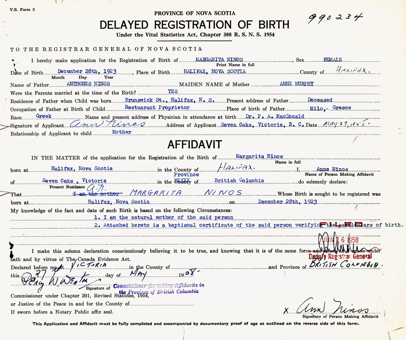 Signature of Applicant Ann Ninas Address of Applicant Seven Oaks, Victoria, British Columbia Date 27 May 1958