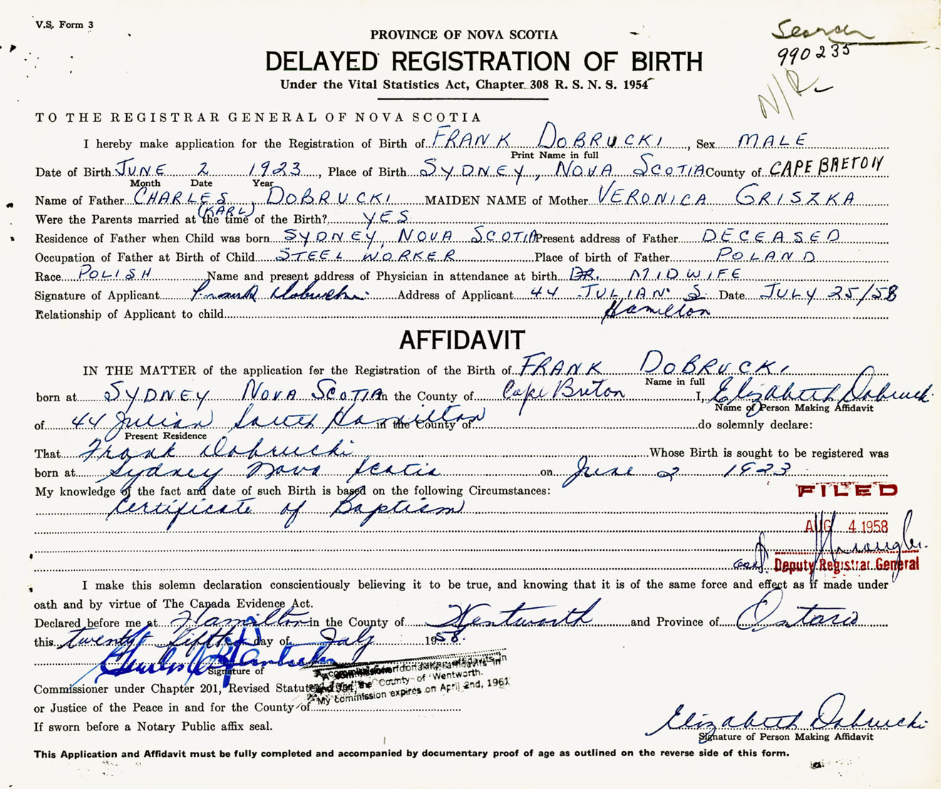 I hereby make application for the Registration of Birth of FrankDobrucki Sex Male