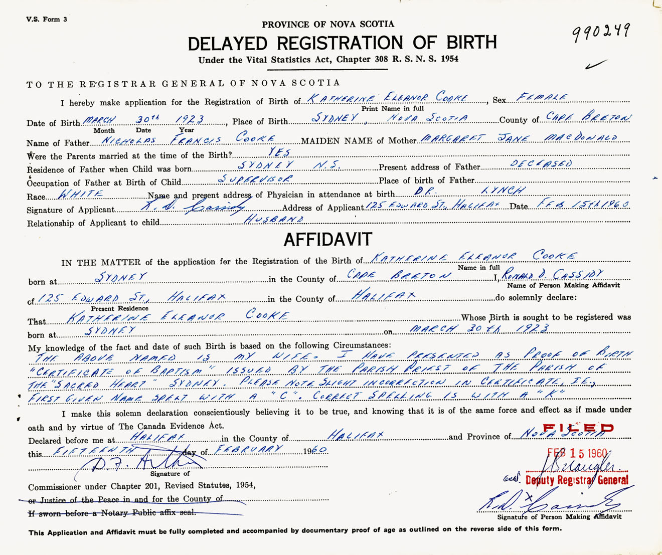 Date of Birth March 30, 1923 Place of Birth SydneyCounty of Cape Breton