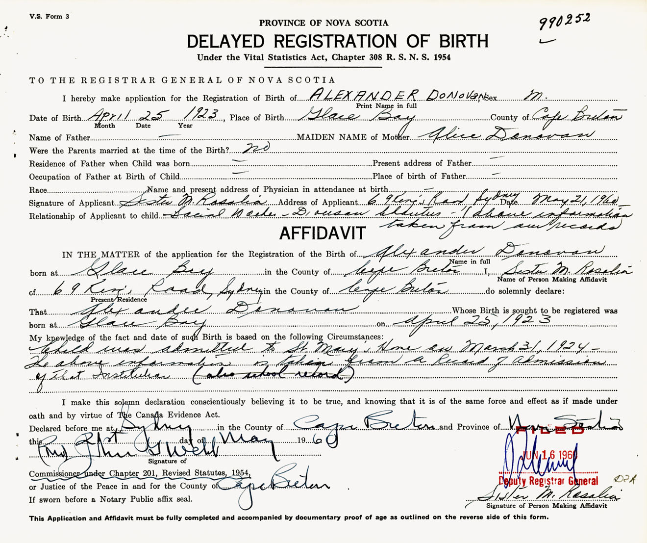 Date of Birth April 25, 1923 Place of Birth Glace BayCounty of Cape Breton