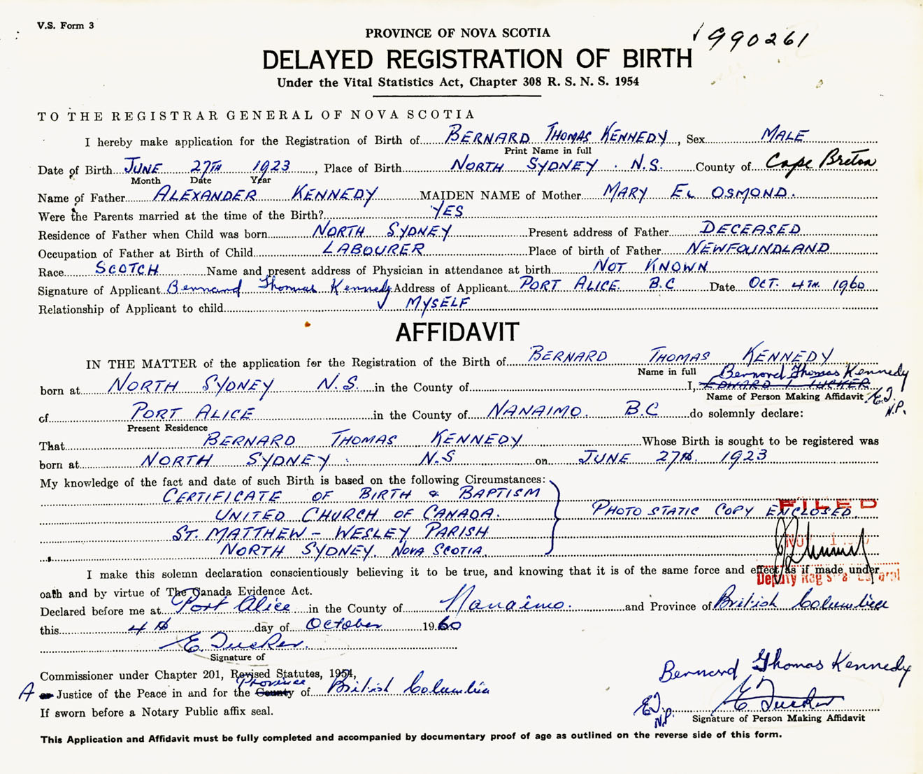 Signature of Applicant Bernard Thomas Kennedy Address of Applicant Port Alice, British Columbia Date 4 October 1960
