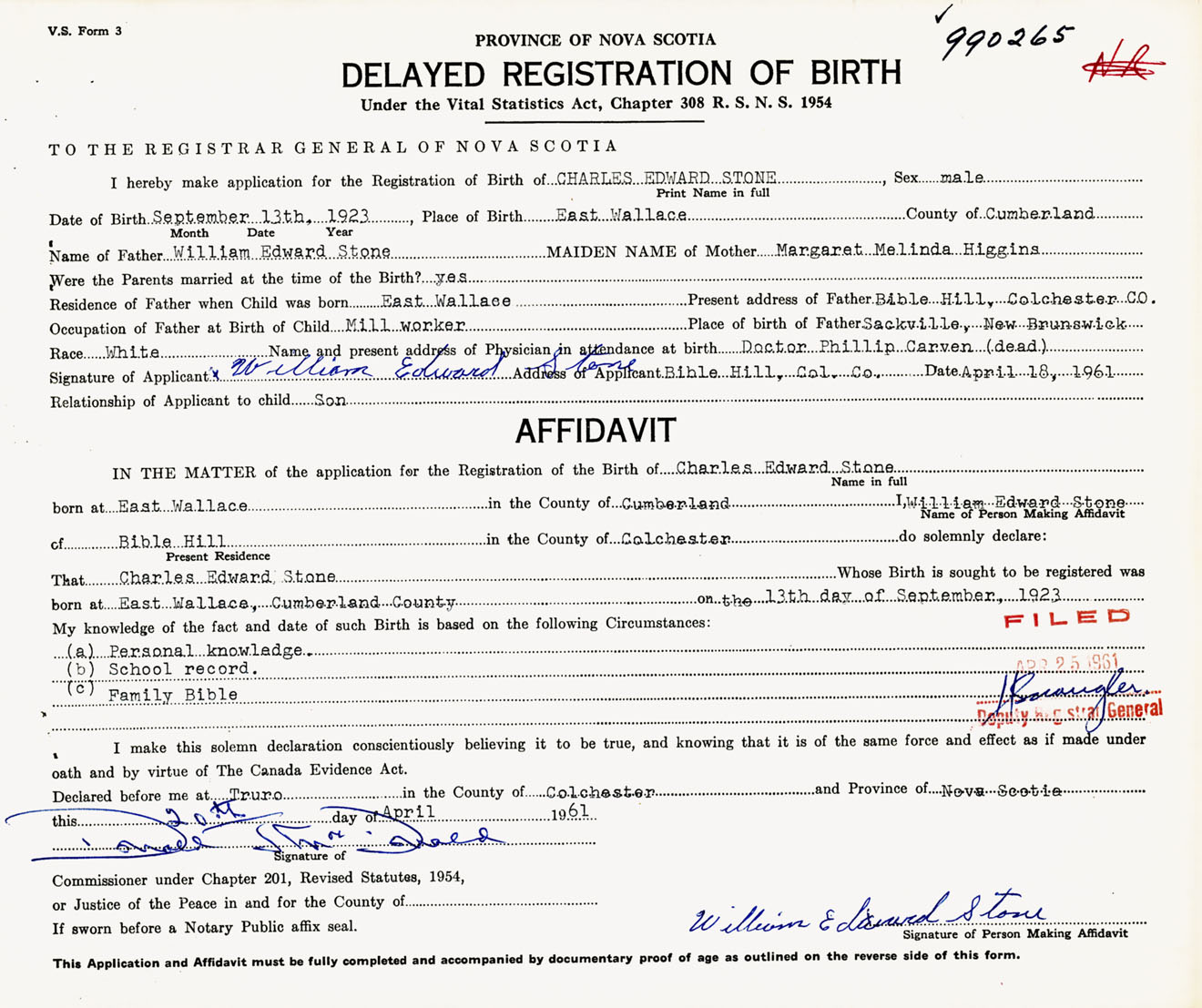 Signature of Applicant William Edward Stone Address of Applicant Bible Hill, Colchester Co., NS Date 18 April 1961