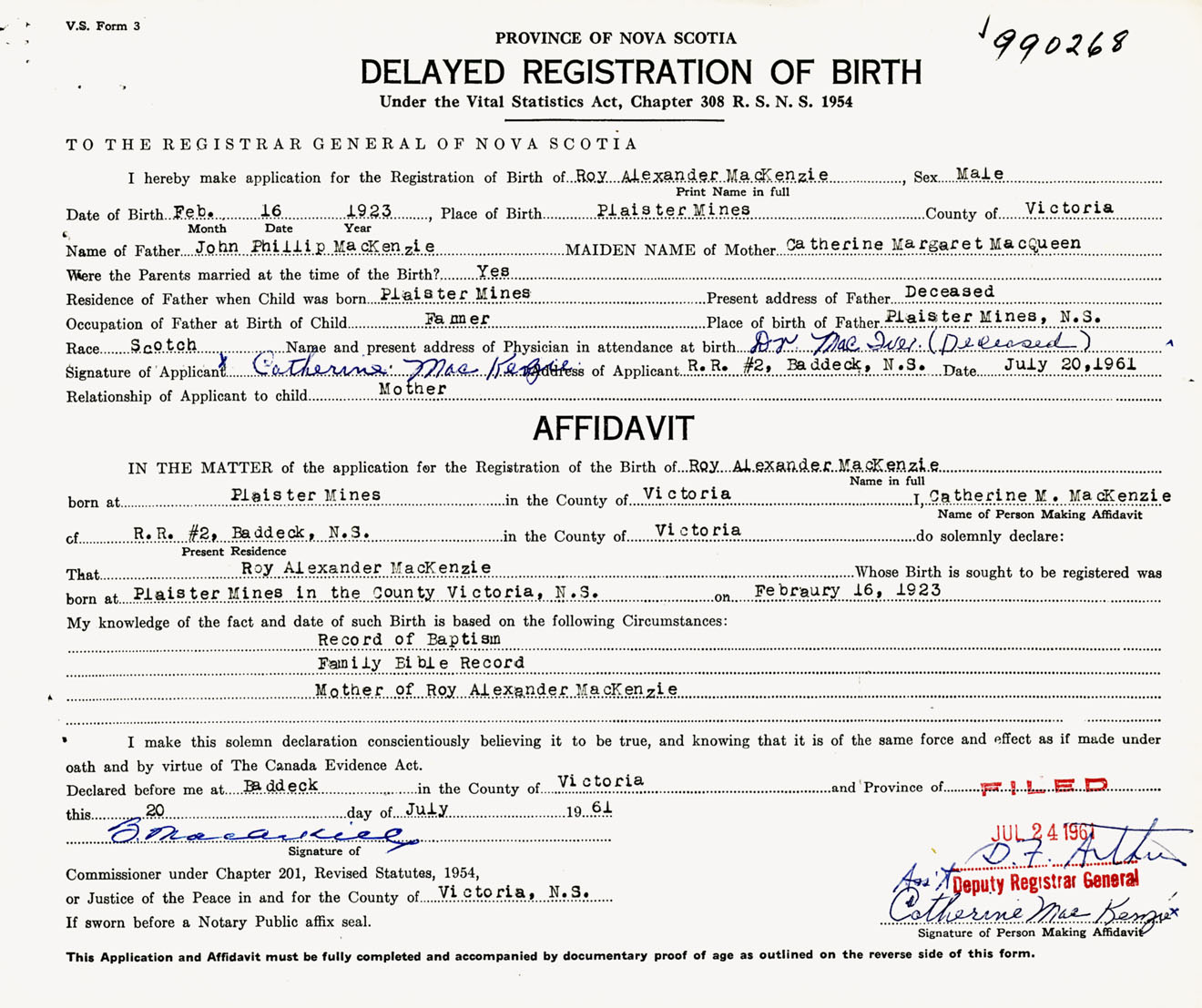 Signature of Applicant Catherine MacKenzie Address of Applicant RR #2, Baddeck, Victoria Co., NS Date 20 July 1961