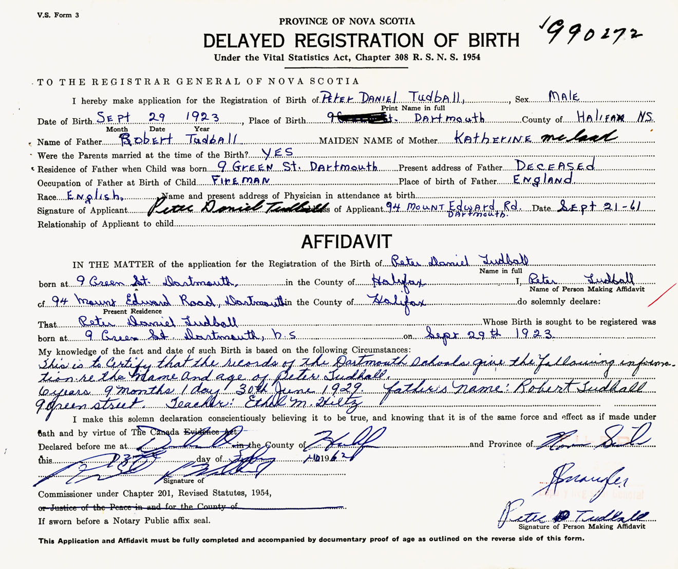 Signature of Applicant Peter Daniel Tudball Address of Applicant 94 Mount Edward Road, Dartmouth, NS Date 21 September 1961
