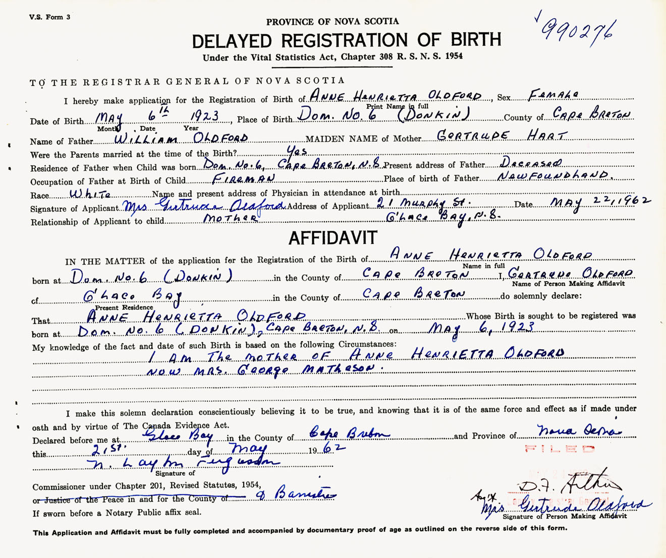 Signature of Applicant Mrs. Gertrude Oldford Address of Applicant 21 Murphy Street, Glace Bay, Cape Breton Co., NS Date 22 May 1962