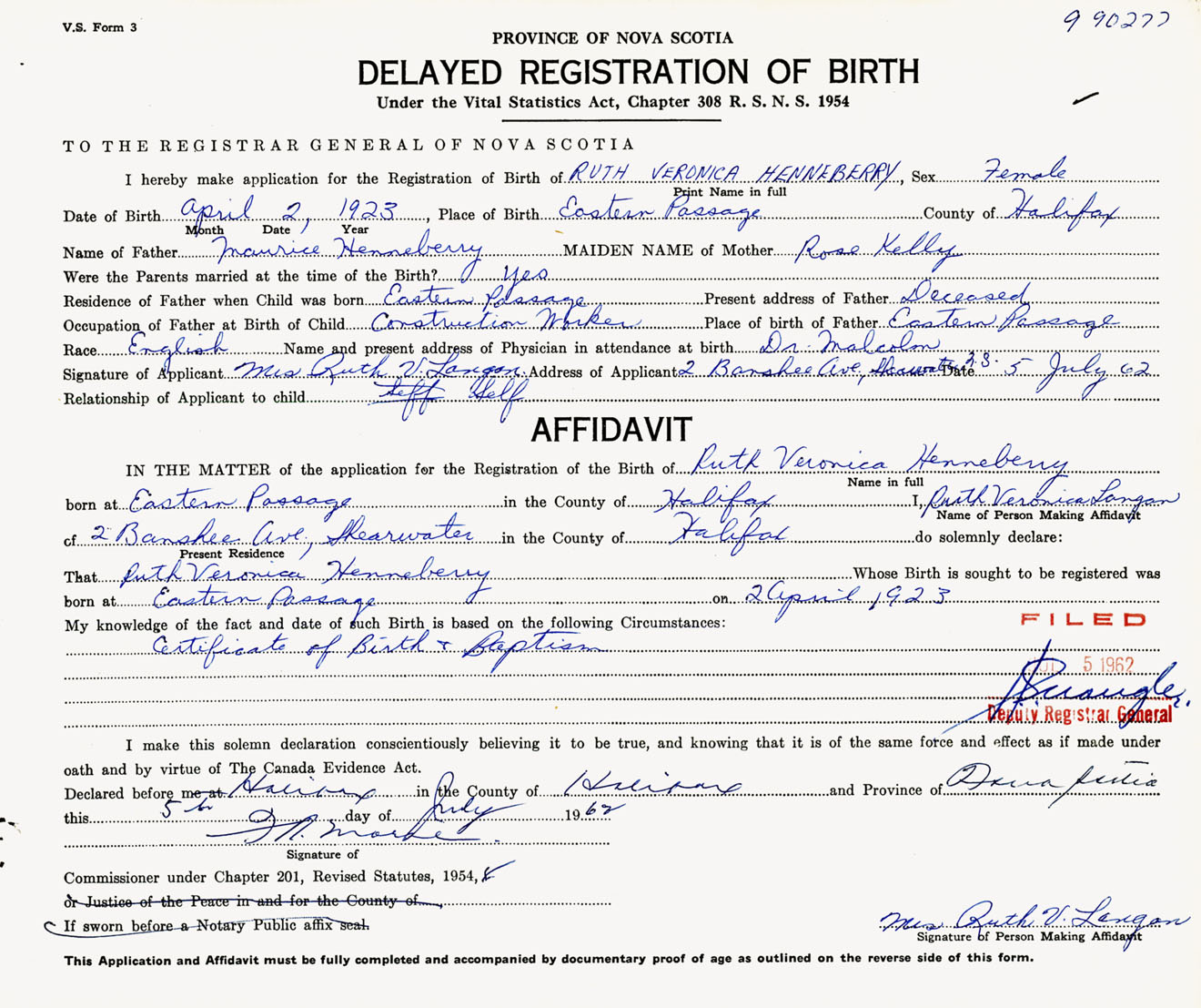 Signature of Applicant Mrs. Ruth V. Langan Address of Applicant 2 Banshee Avenue, Shearwater, Halifax Co., NS Date 5 July 1962