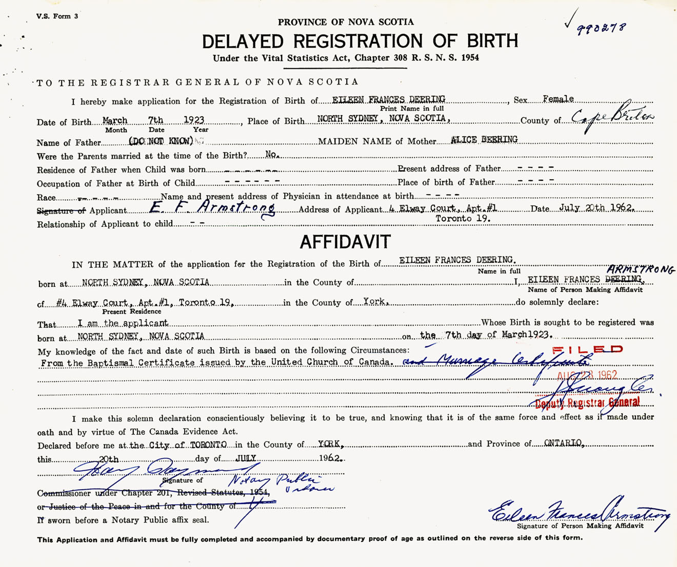 Signature of Applicant E. F. Armstrong Address of Applicant 4 Elway Court, Apt 1, Toronto, Ontario Date 20 July 1962