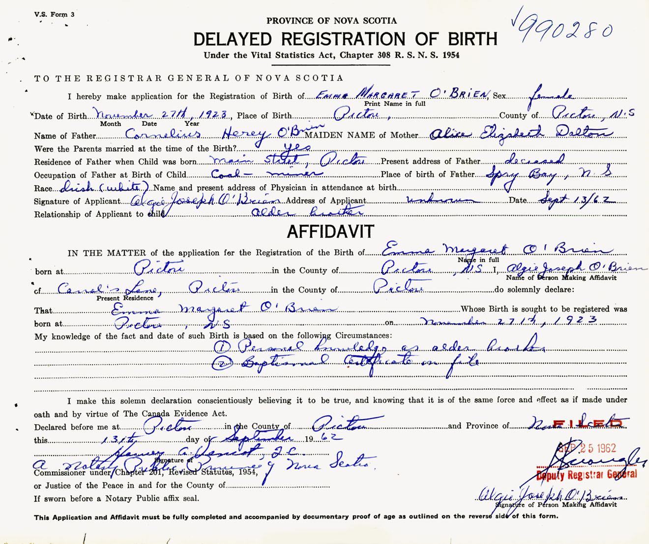 Date of Birth November 27, 1923 Place of Birth PictouCounty of Pictou