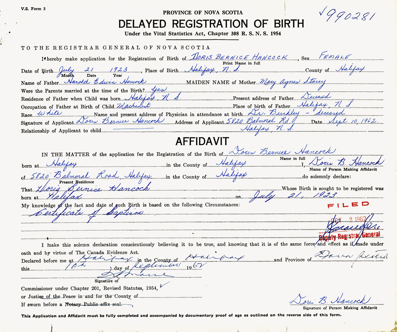 Signature of Applicant Doris Bernice Hancock Address of Applicant 5820 Balmoral Road, Halifax, NS Date 10 September 1962