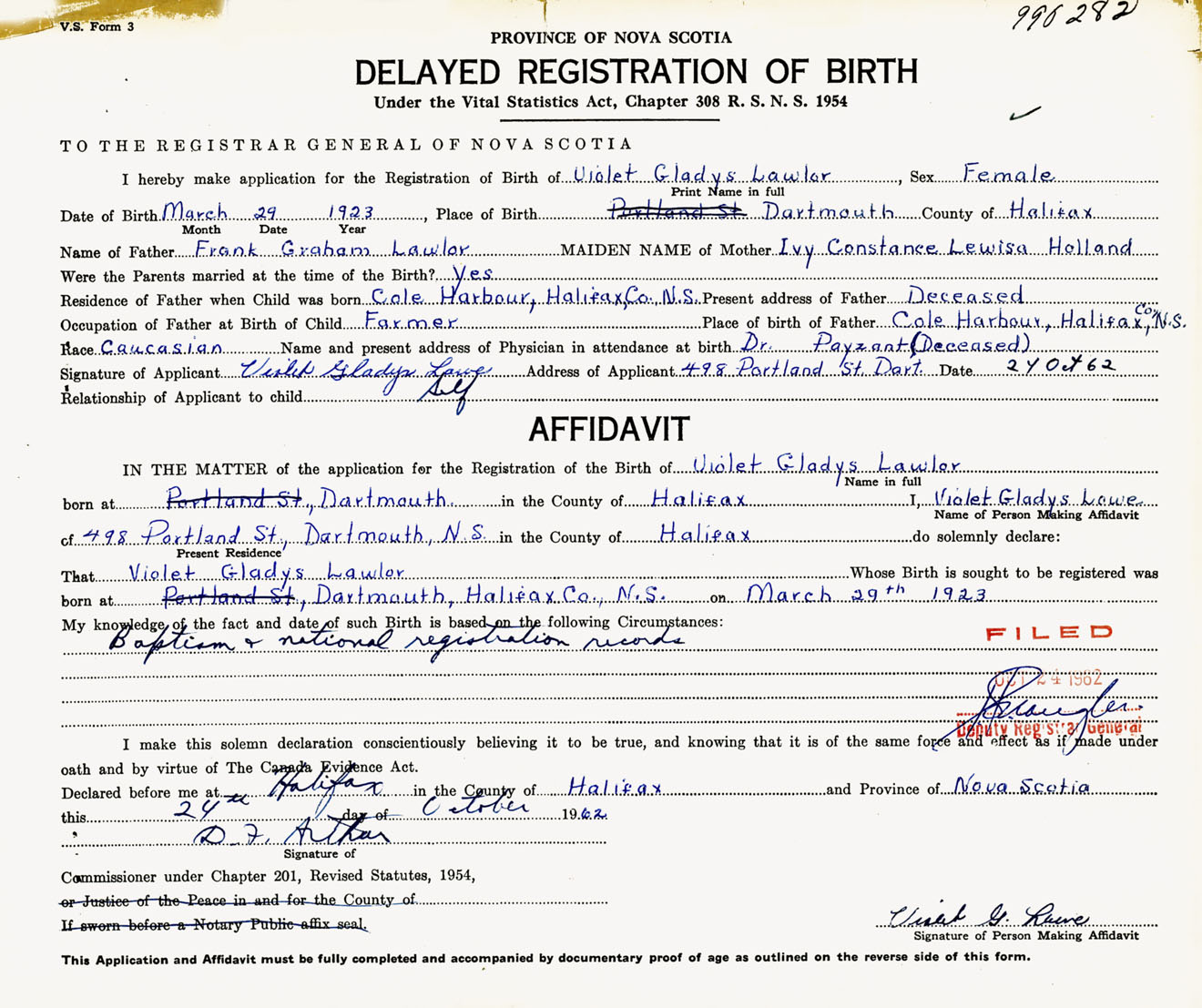 Signature of Applicant Violet Gladys Lowe Address of Applicant 498 Portland Street, Dartmouth, NS Date 24 October 1962
