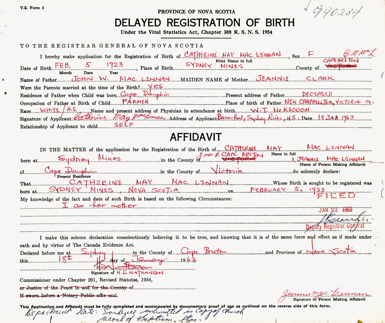 Signature of Applicant Catherine May MacLennan Address of Applicant Sydney River, Cape Breton Co., NS Date 18 January 1963