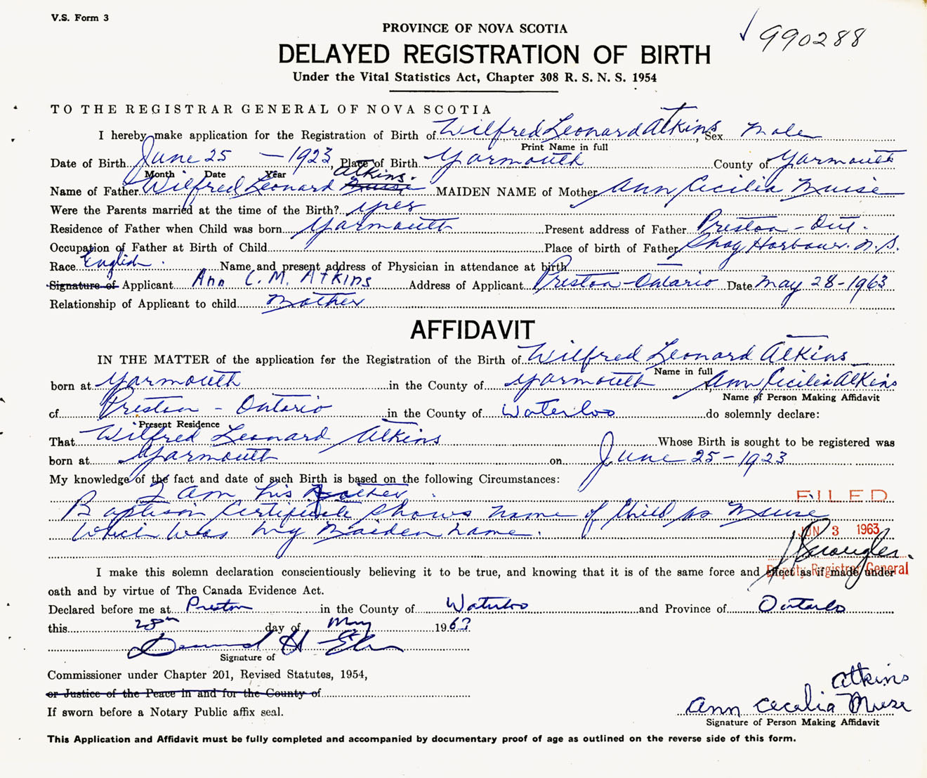 Signature of Applicant Ann C. M. Atkins Address of Applicant Preston, Ontario Date 28 May 1963