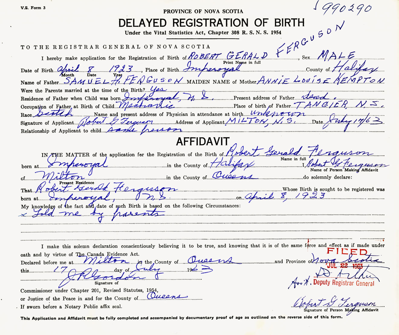 Signature of Applicant Robert G. Ferguson Address of Applicant Milton, Queens Co., NS Date 17 July 1963
