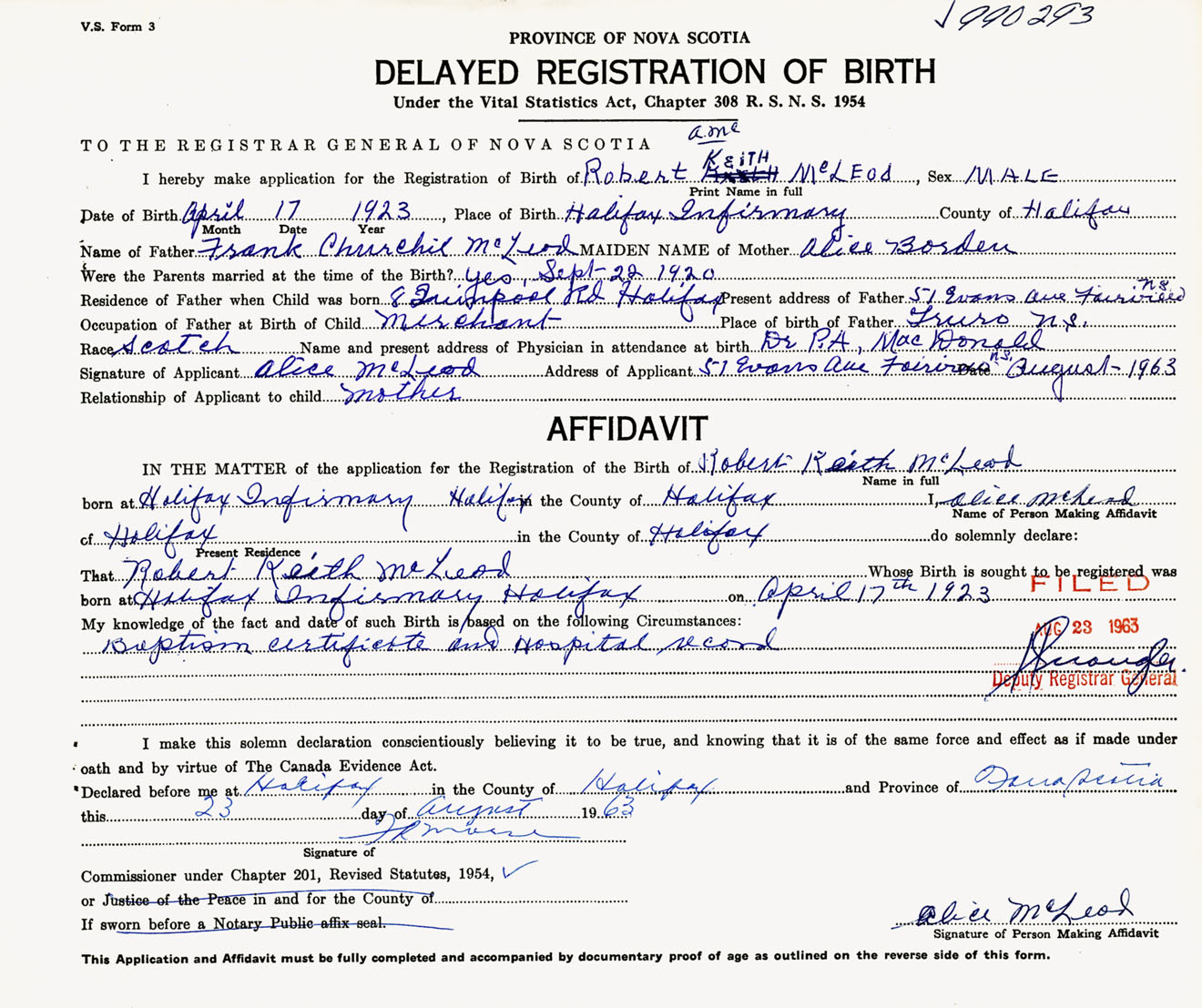 Signature of Applicant Alice McLeod Address of Applicant 51 Evans Avenue, Fairview, NS Date August 1963