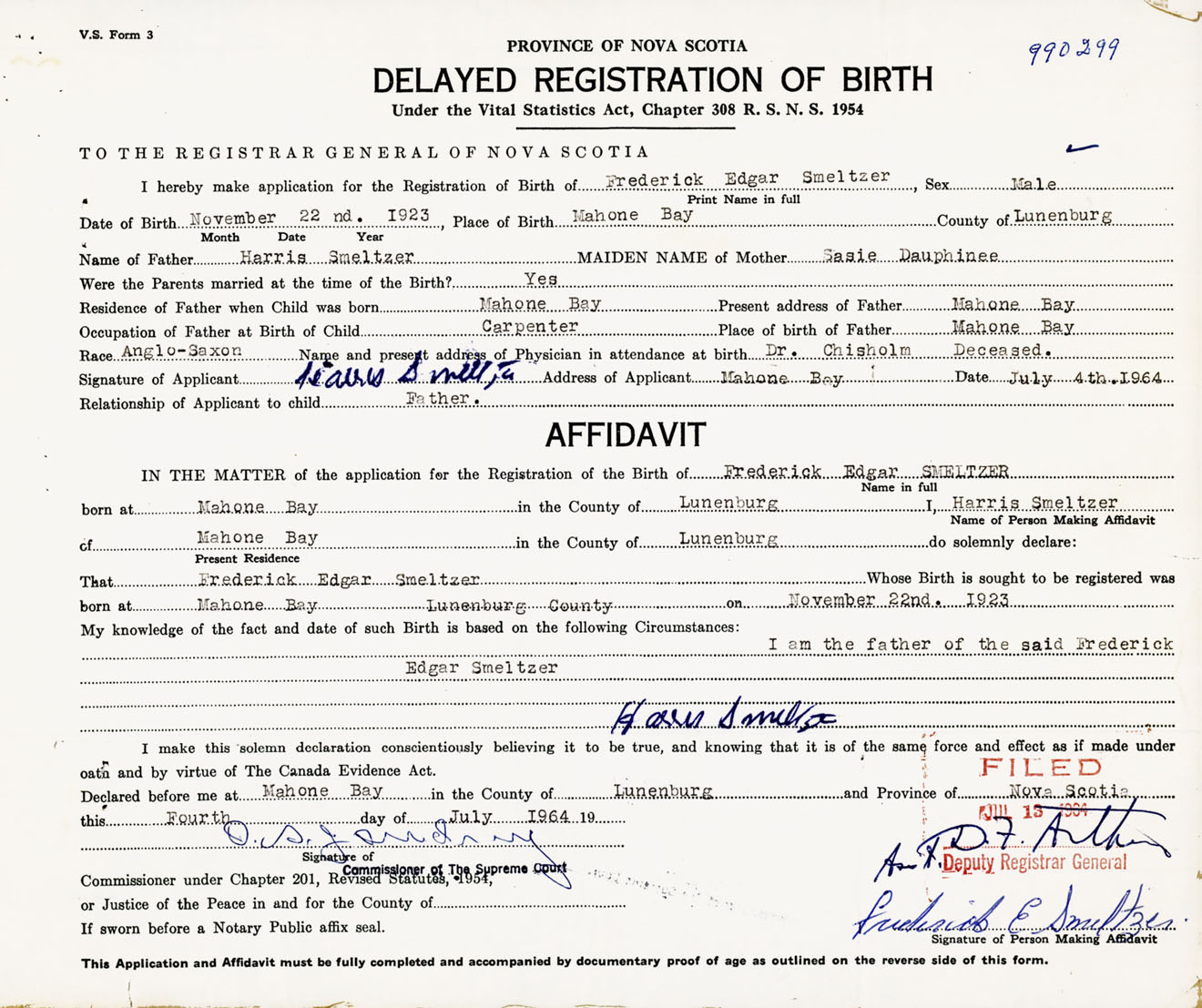 Signature of Applicant Harris Smeltzer Address of Applicant Mahone Bay, Lunenburg Co., NS Date 4 July 1964