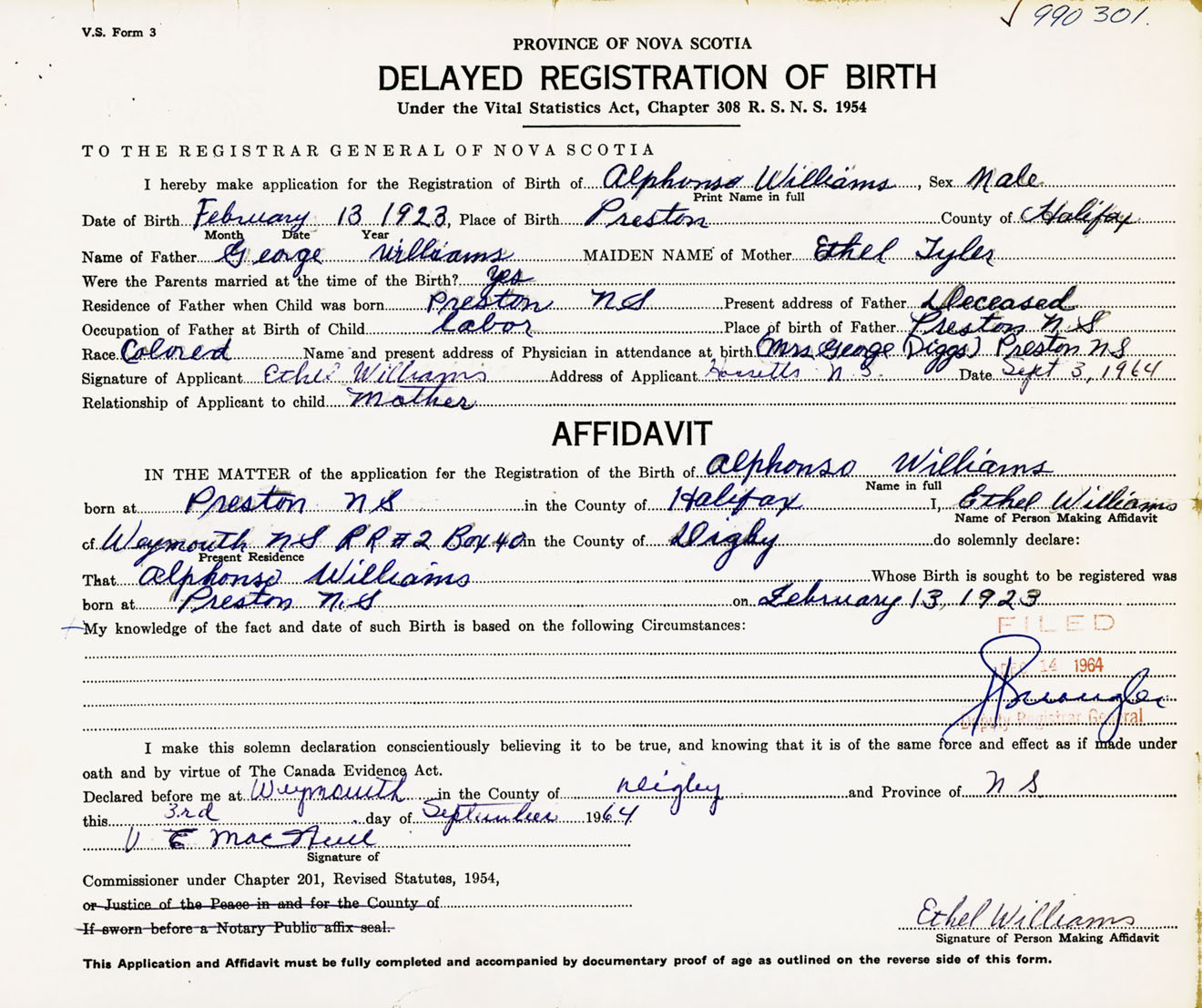 IN THE MATTER of the application for the Registration of the Birth of AlphonsoWilliams