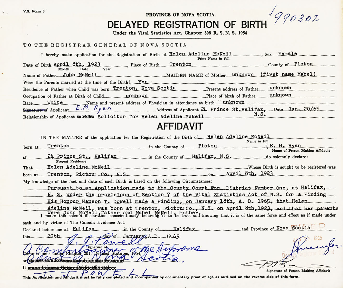 Pursuant to an Application made to the County Court for District Number One, at Halifax, NS under the provisions of Section 7 of the Vital Statistics Act of NS for a Finding His Honour Hanson T. Dowell made a finding, on January 18th, AD, 1965, that Helen Adeline McNeil was born at Trenton, Pictou Co., NS on April 8, 1923 and that her parents were John McNeil, father and Mabel McNeil, mother.