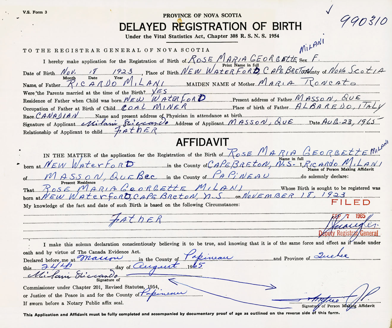 I hereby make application for the Registration of Birth of Rose Maria GeorgetteMilani Sex Female