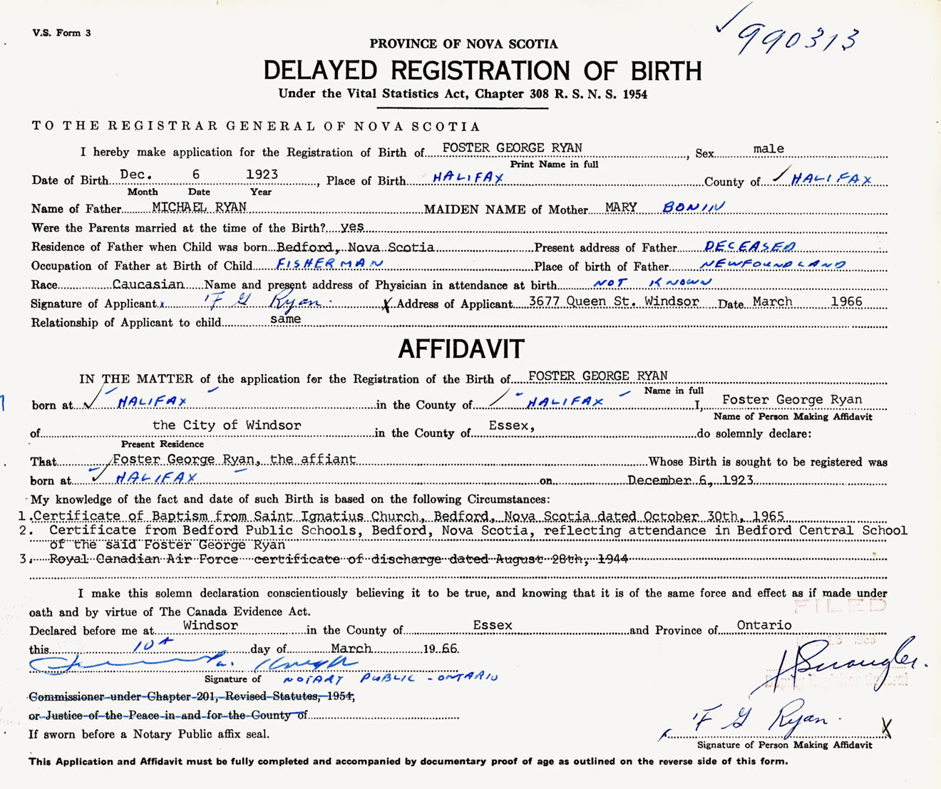 1. Certificate of Baptism from Saint Ignatius church, Bedford, NS, dated October 30, 1965 2. Certificate from Bedford Public Schools, Bedford, NS, reflecting attendance in Bedford Central School of the said Foster George Ryan. 3. Royal Canadian Air Force certificate of discharge dated August 28th, 1944.