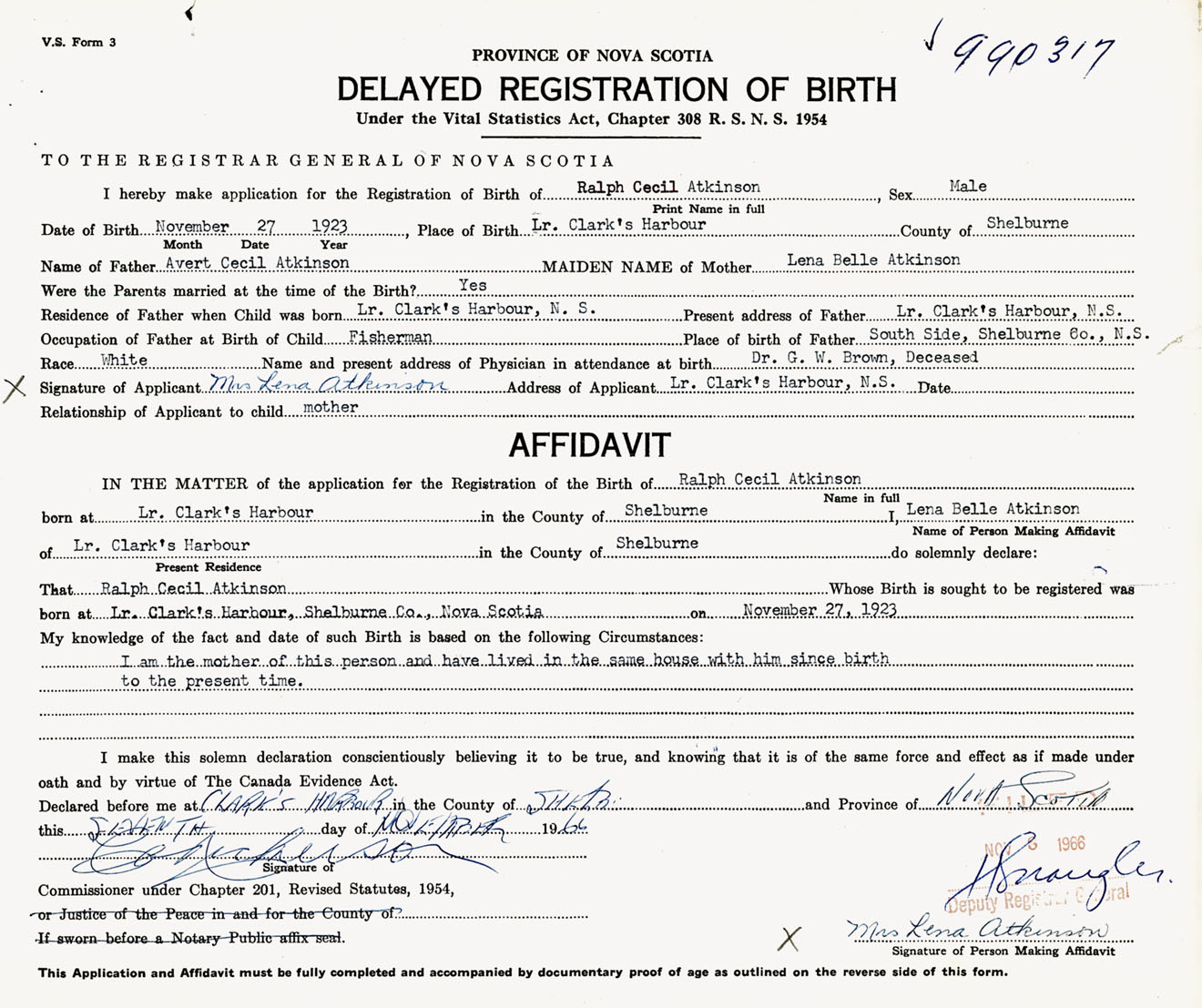 Date of Birth November 27, 1923 Place of Birth Lower Clarks HarbourCounty of Shelburne