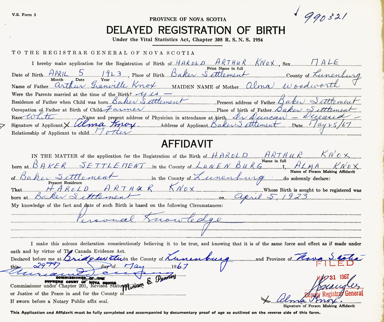 Signature of Applicant Alma Knox Address of Applicant Baker Settlement, Lunenburg Co., NS Date 25 May 1967
