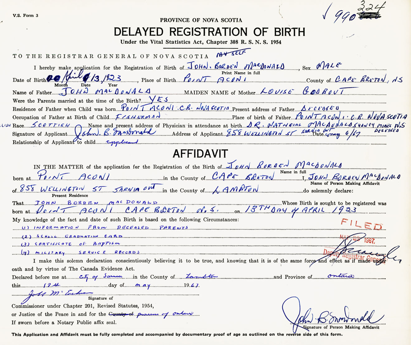 Date of Birth April 13, 1923 Place of Birth Point AconiCounty of Cape Breton