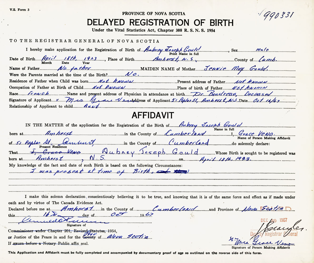 I hereby make application for the Registration of Birth of Aubrey JosephGould Sex Male