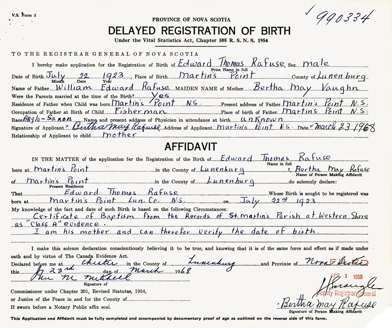 Signature of Applicant Bertha May Rafuse Address of Applicant Martins Point, Lunenburg Co., NS Date 23 March 1968